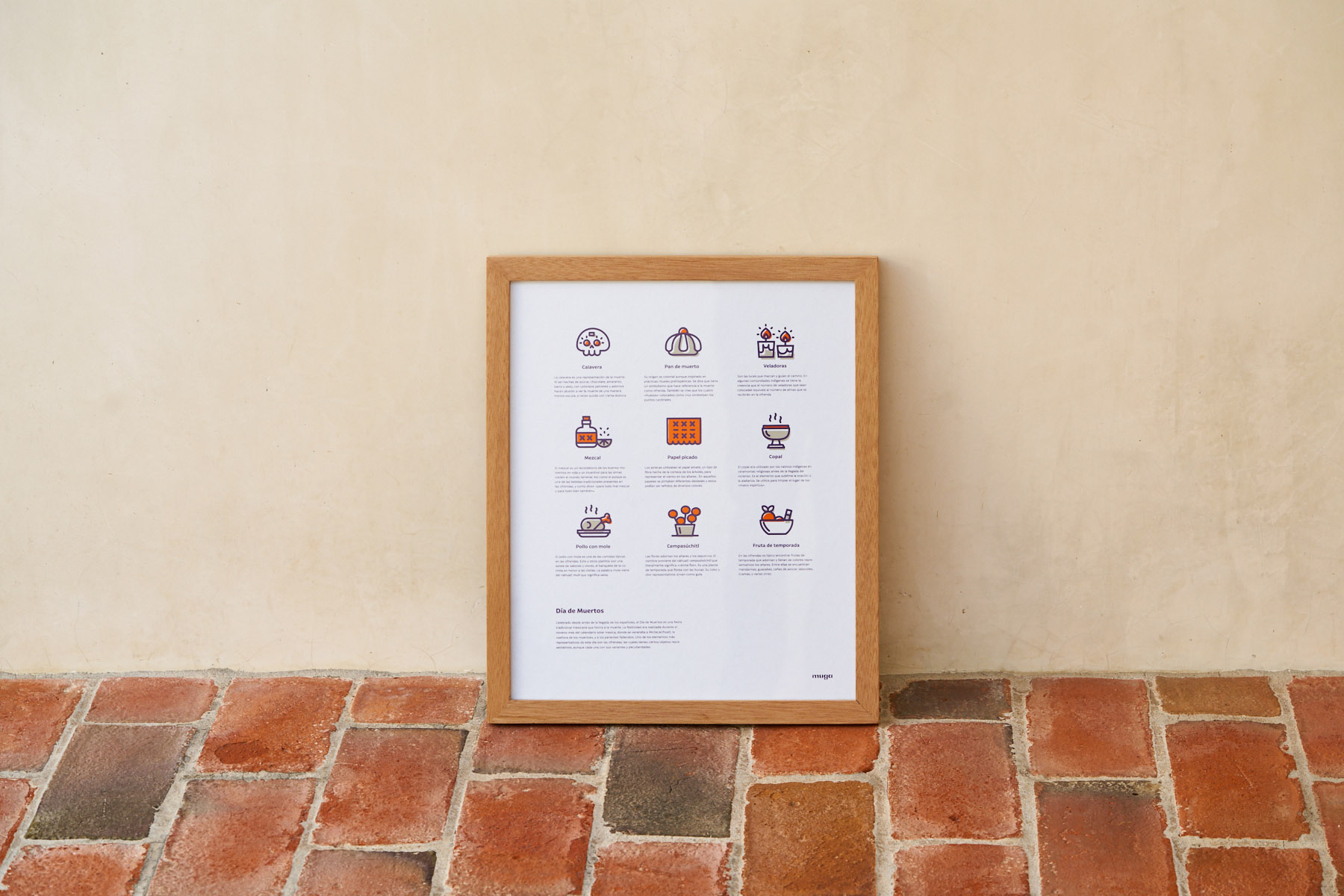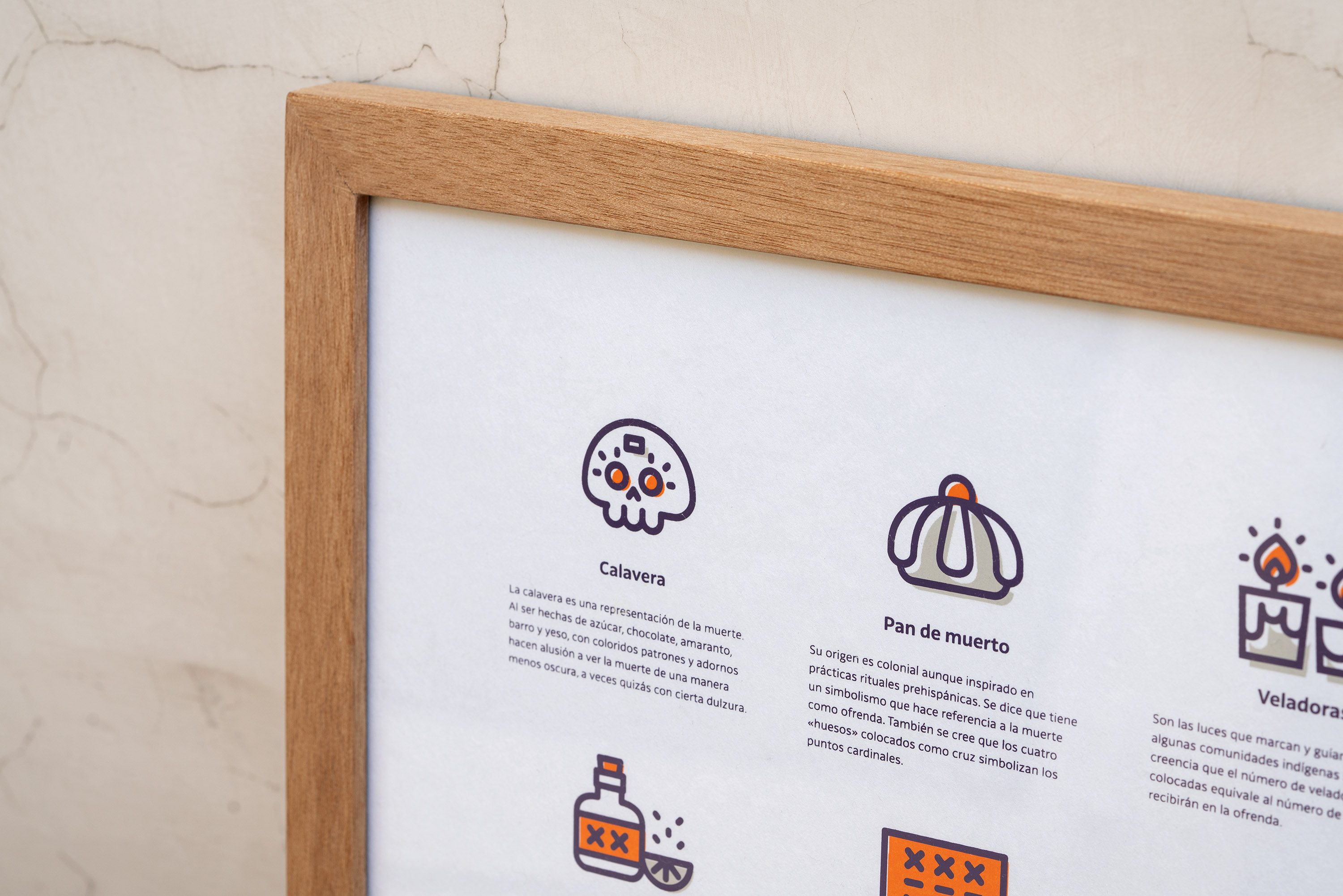 The project was mainly expressed through a set of carefully designed icons that represent the key elements of the ofrenda. This visual “dissection” highlights each component not only as a symbol, but as a vessel of cultural memory, allowing for a reinterpretation that honors tradition while preserving its cultural value in a rapidly changing world.