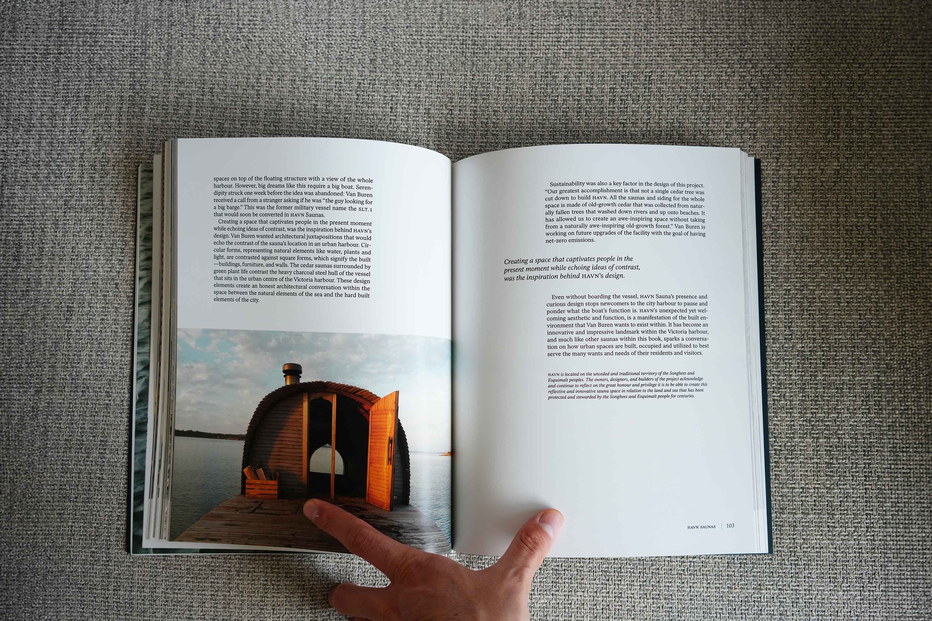 More than just a visual collection, the book is rooted in the context of Victoria, BC—where the project originated through HAVN Saunas. Inspired by the area's landscapes, shorelines, and contrast between wilderness and urban life, the book explores saunas as sanctuaries of self-discovery and healing.
